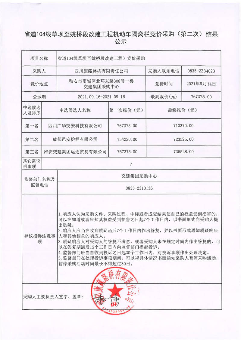 四川康藏路橋有限責(zé)任公司省道104線(xiàn)草壩至姚橋段改建工程機(jī)動(dòng)車(chē)隔離欄競(jìng)價(jià)采購(gòu)(第二次)結(jié)果公示