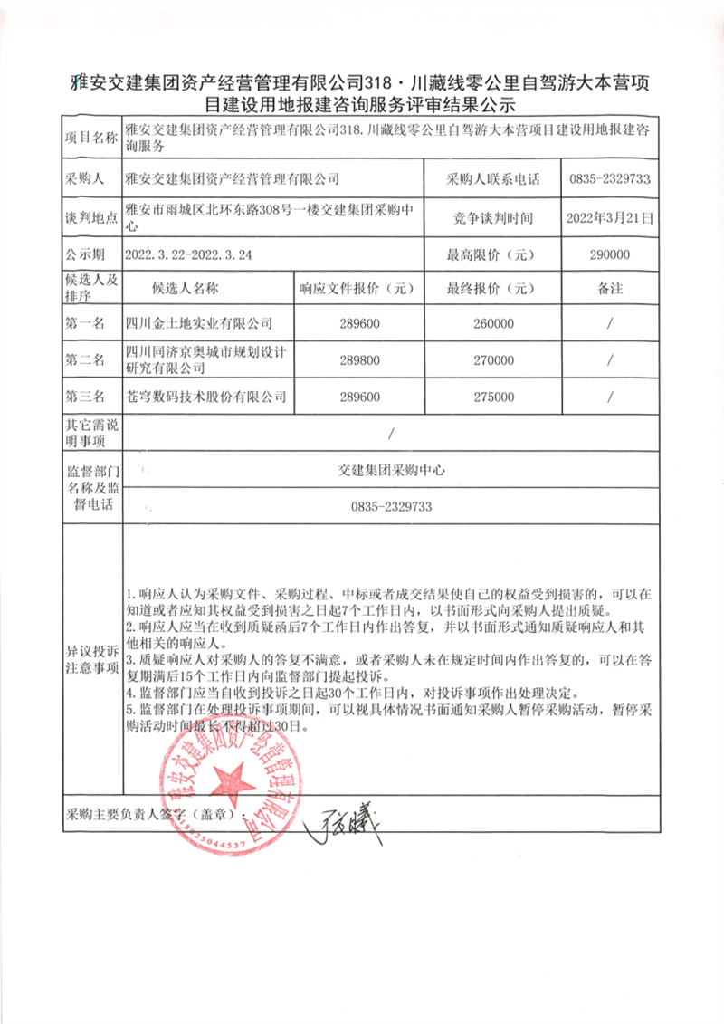 雅安交建集團(tuán)資產(chǎn)經(jīng)營(yíng)管理有限公司318川藏線零公里自駕游大本營(yíng)項(xiàng)目建設(shè)用地報(bào)建咨詢服務(wù)評(píng)審結(jié)果公示